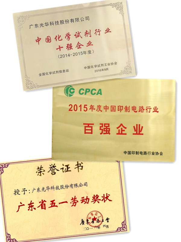 30多年來,光華科技一直專注于“高性能電子化學(xué)品”和“高質(zhì)量化學(xué)試劑”為主導(dǎo)的專用化學(xué)品產(chǎn)業(yè)領(lǐng)域,在PCB行業(yè)及化學(xué)試劑行業(yè)獲得了社會的普遍認(rèn)可: ● 再次榮獲“中國PCB專用化學(xué)品第1名” ● 再次榮獲“化學(xué)試劑行業(yè)十強企業(yè)” ● 氧化銅、硫酸鎳產(chǎn)品被評為“廣東省名牌產(chǎn)品” ● 被評為“廣東省創(chuàng)新型企業(yè)” ● 被評為“國家知識產(chǎn)權(quán)優(yōu)勢企業(yè)” ● 獲頒“廣東省五一勞動獎狀” |