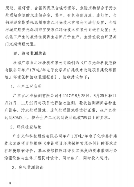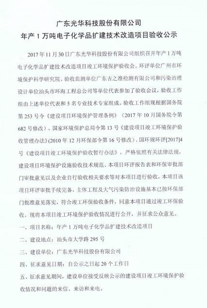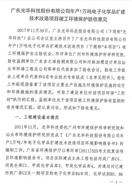 光華科技年產(chǎn)1萬噸電子化學(xué)品擴建技術(shù)改造項目于2017年11月30日組織了項目竣工環(huán)保自主驗收,經(jīng)過專家組及參會人員的共同評審,同意本項目通過竣工環(huán)保驗收,現(xiàn)予以公開。