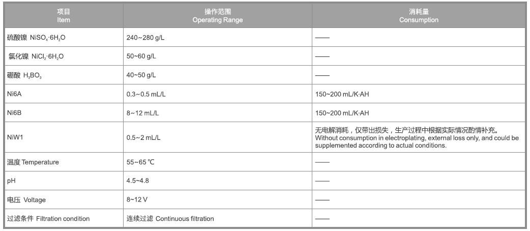 Ni6A:俗稱光亮劑,負(fù)責(zé)出光和填平。Ni6A不足時,出光速度變慢;Ni6A過量時,低電流密度區(qū)發(fā)暗,鍍層脆性大;